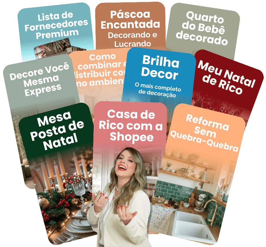 Mesmo que você nunca tenha decorado nada, vai aprender desde reforma sem quebra-quebra, até decoração com produtos da Shopee, mesa posta, cores, Páscoa, Natal e muito mais.
